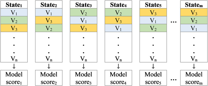 Therefore, according to Equation 11, a feature can present n! different states when all values are considered in the permutation process (Let n! = m). The model is then trained using the dataset which includes one permuted (shuffled) feature and yields a specific score (e.g., accuracy) after each state (see Figure 6). In Figure 6, Vi (i = 1, … , n) are different values of n samples of a specific feature.