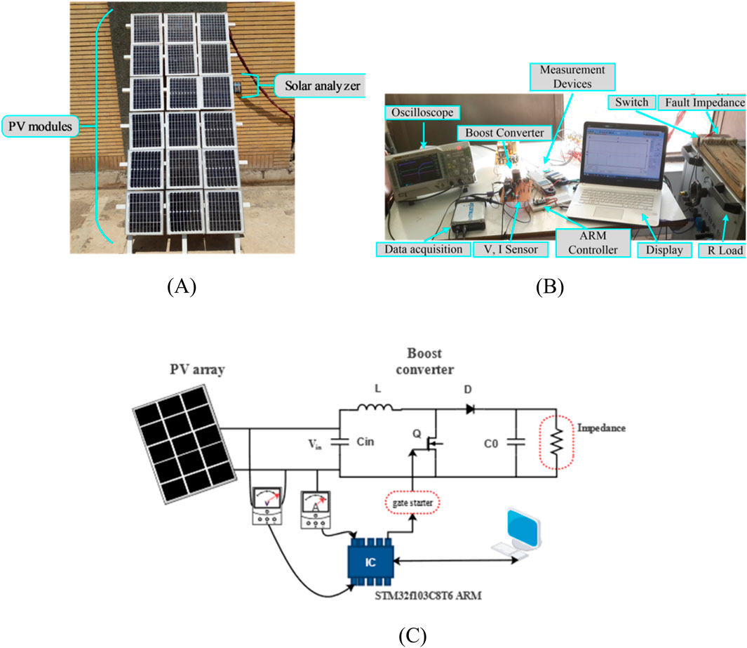 Figure 7. (A) Experimental 3 × 6 PV array (B) DC-DC boost converter and other equipment (C) Data collection station to elicit the PV array I-V curves.