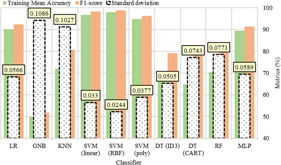 Following the application of fuzzy logic and subsequent fuzzification, each individual classifier is assigned a score between 0 and 100 according to MoM defuzzification technique and based on three metrics: training mean accuracy, standard deviation, and F1-score (see Figure 9B). The resulting scores serve as an index of classifiers well-suited for the combination. Figure 9B displays the classifiers scores based on MoM defuzzification technique. In this study, the classifiers with the score of 50 and above are selected for the combination which, according to Figure 9B, include LR, SVM (linear), SVM (RBF), SVM (poly), RF, and MLP.