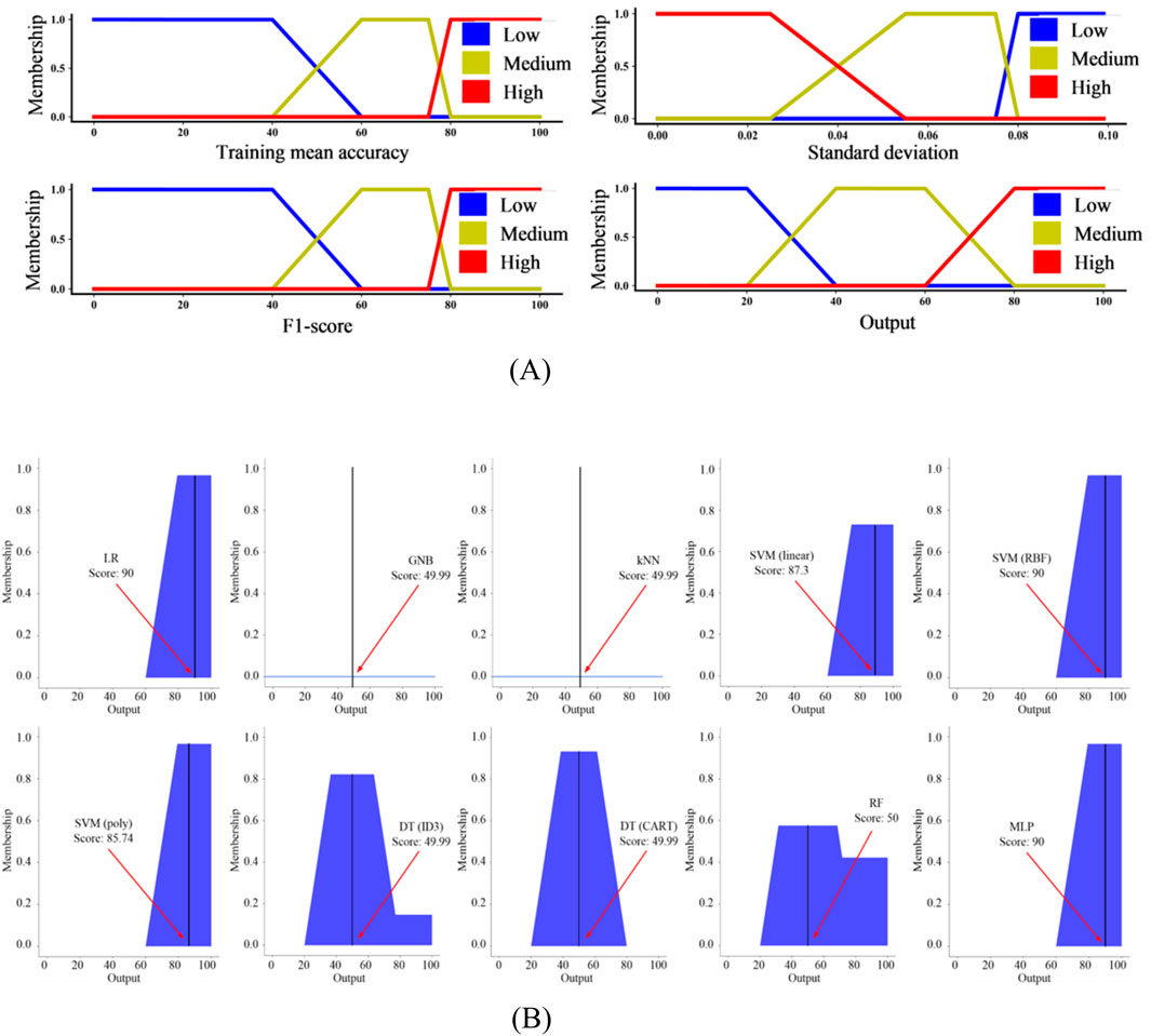 Figure 9. (A) Membership functions for training mean accuracy, standard deviation, F1-score and the output (B) MoM-based defuzzification of final shape in each classifier.