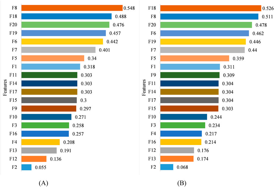 Figure 11. The importance of features in permutation method: (A) scoring features based on their importance in mean rule technique, and (B) scoring features based on their importance in majority vote rule, product rule, max rule, min rule, and median rule techniques.