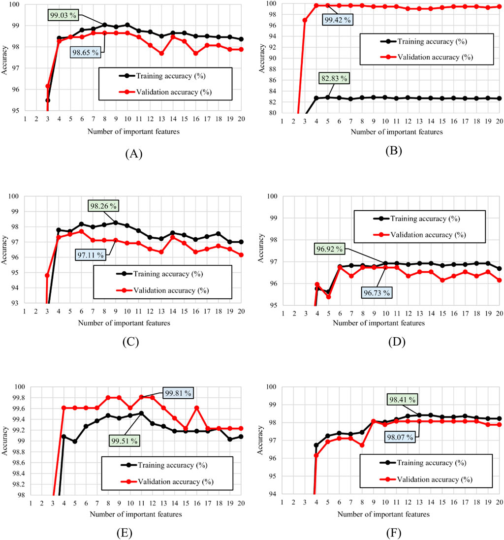 Figure 12. Training and validation accuracies during the permutation feature selection process based on six different rules (A) Product rule (B) Max rule (C) Min rule (D) Median rule (E) Mean rule (F) Majority voting rule.