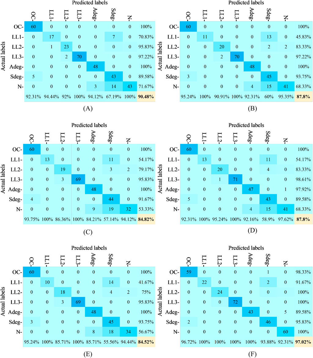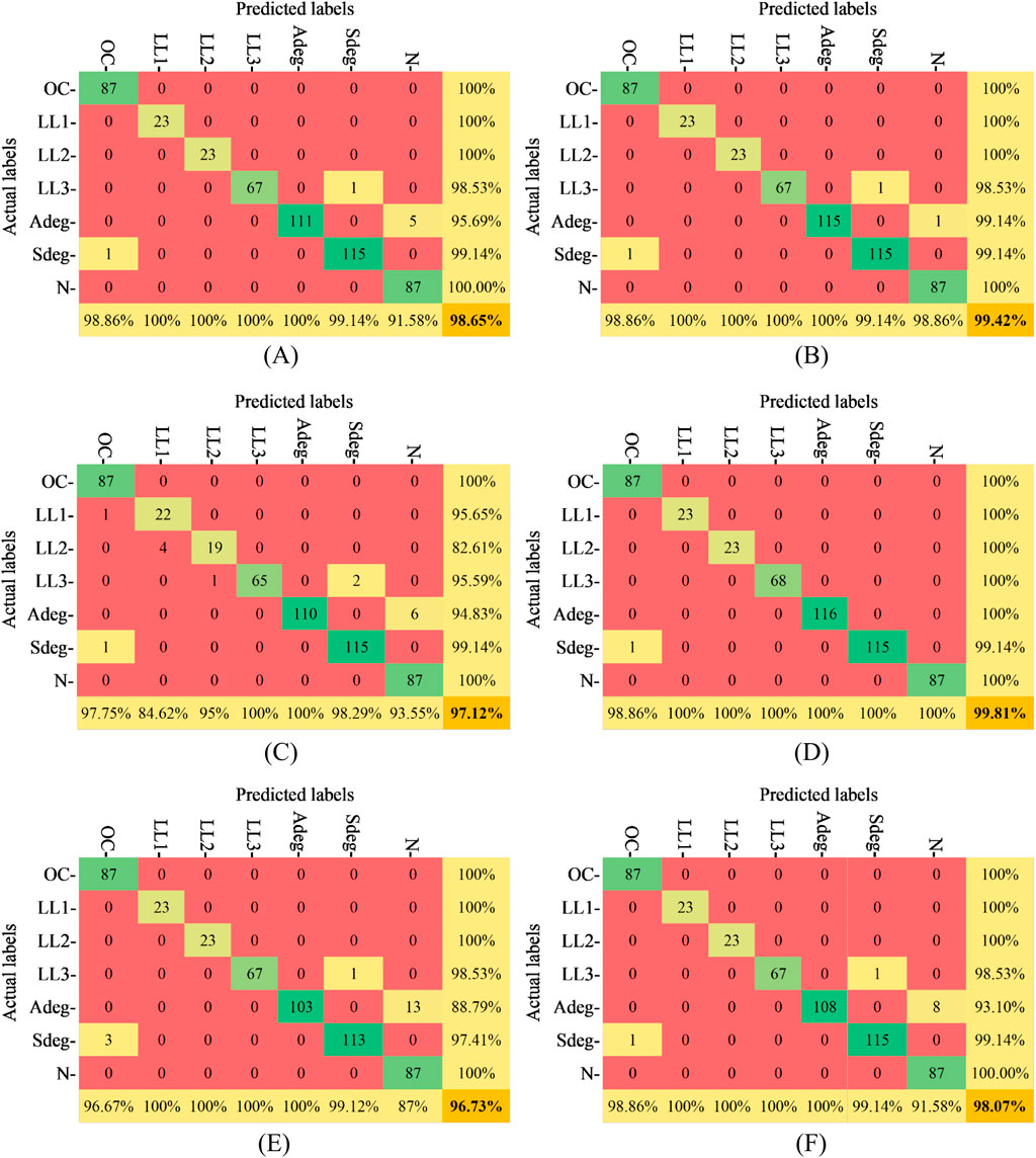 Figure 15. Test accuracies in different combination techniques (A) Majority voting rule (B) Product rule (C) Max rule (D) Min rule (E) Median rule (F) Mean rule.