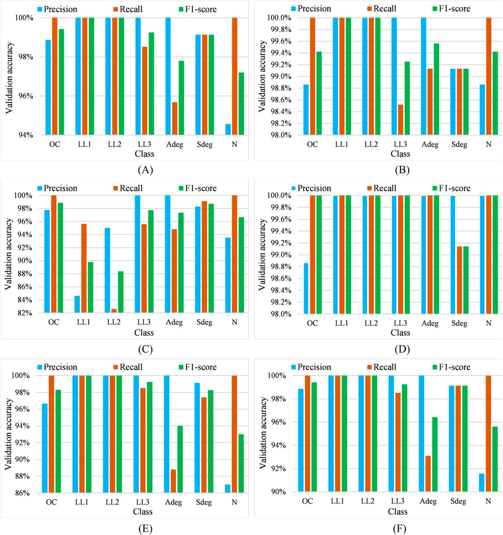 Figure 14. Class-wise validation metric values in different combination techniques (A) Product rule (B) Max rule (C) Min rule (D) Mean rule (E) Median rule (F) Majority voting rule.