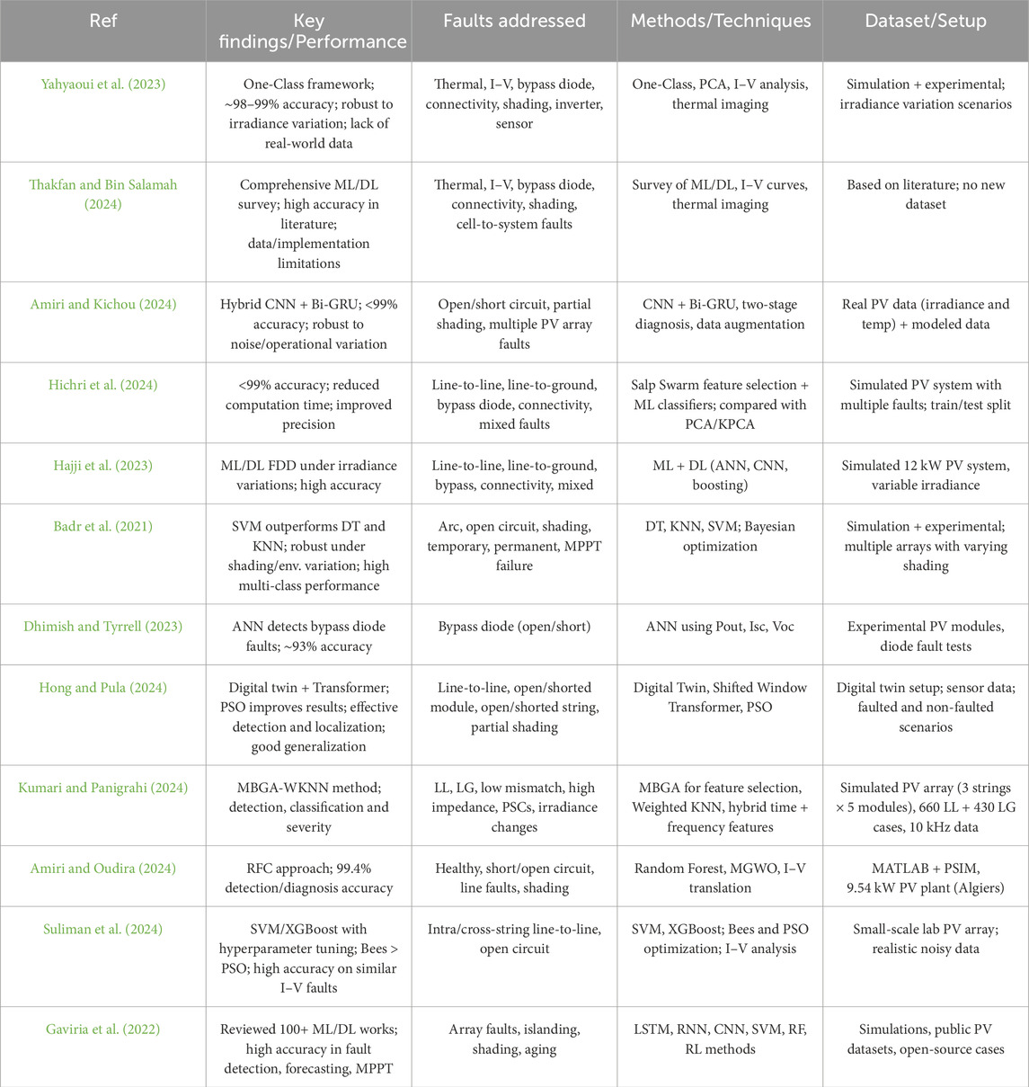 To consolidate the recent literature on PV fault detection, Table 1 provides a comparative summary of representative studies. It highlights the datasets, fault types, methods, and key findings, thereby illustrating the progress and limitations of state-of-the-art approaches.
