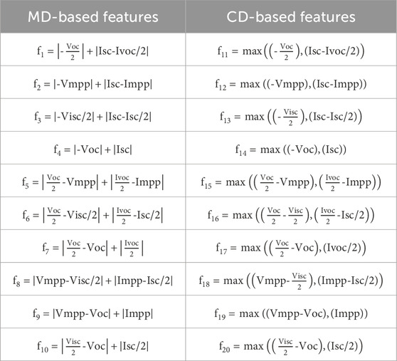• Numerous features have been utilized in past models from the PV array I-V curve. However, this study proposes the Manhattan distance and Chebyshev distance techniques to extract various features from the PV array I-V curve according to five predefined points. In addition, to avoid redundancy and select only the most effective features thus reducing the dataset dimensionality and making the final model less computationally complex, the permutation feature selection technique is employed.