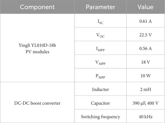 To evaluate the proposed model, a stand-alone experimental PV system including a 3 × 6 PV array (three parallel strings each containing six Yingli YL010D-18 b PV modules in series) has been designed along with a DC-DC boost converter which are depicted in Figure 7. The PV modules used in the setup are rated at 10 W with Voc = 22.5 V, Isc = 0.61 A, VMPP = 18 V, and IMPP = 0.56 A. The detailed specifications of the PV modules and the DC-DC boost converter are summarized in Table 4.