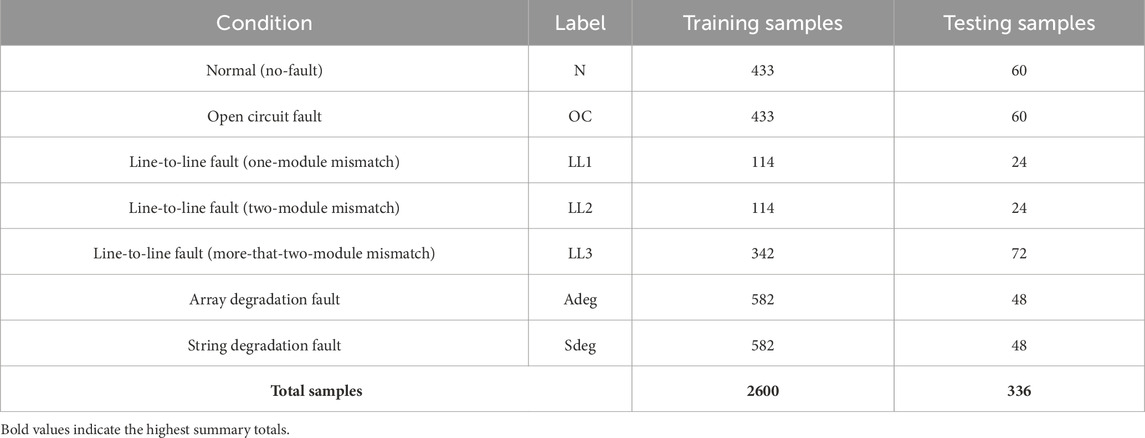 During the experimental data collection process, 2936 samples are collected under different conditions, such as no-fault conditions, open circuit faults, line-to-line faults, and degradation faults. The initial dataset includes 2600 training samples and 336 samples for testing the final model which is further detailed in Table 5.