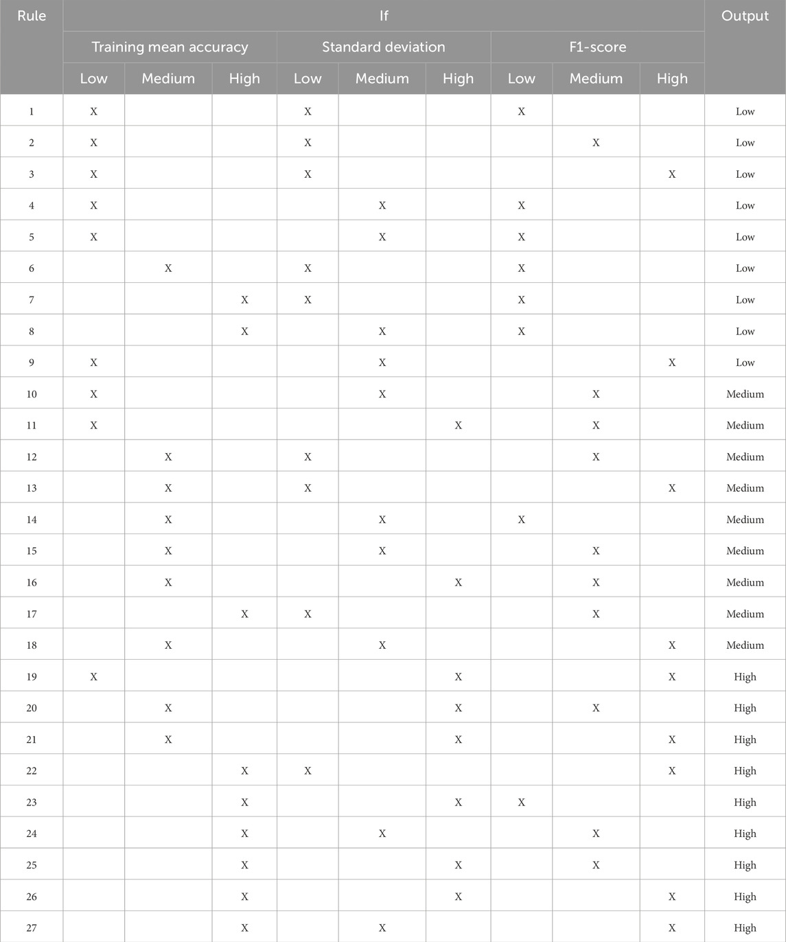 In this study, this methodology employs the training mean accuracy, standard deviation, and F1-score as input variables, along with an output variable that represents the score achieved by each classifier, adhering to predetermined standards to assess efficacy and determine scores.