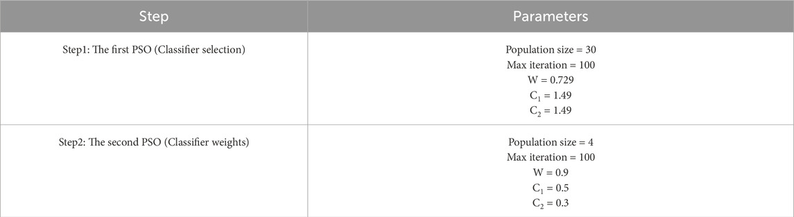 Three SVM classifiers with linear, RBF, and polynomial kernels have been selected as the best classifiers to participate in the final model. Before combining the output of each classifier to make the final model, the weight of each classifier needs to be assigned and optimized. This approach prioritizes the classifiers which show higher accuracies as they have substantially more impact on the final model accuracy. A mathematical programming model has been developed for this purpose, and PSO has solved the problem of assigning weights to each SVM classifier with linear, RBF, and polynomial kernels. The PSO variables are explained in Table 7 (Step 2). It's important to note that Step 1 requires further exploration, which is why it employs a larger population, balanced coefficients C1 and C2, and a lower inertia weight. In contrast, Step 2 focuses on stability, utilizing a smaller population, reduced coefficients C1 and C2, and a higher inertia weight. The most optimal weight values for SVM (linear), SVM (RBF), and SVM (poly) are 0.35, 0.5, and 0.15, respectively. After training these classifiers, it is necessary to perform their validation process during each of the techniques (product rule, max rule, min rule, mean rule, median rule, and majority vote rule) of the combination. These weights are allocated to max, min, mean, and median rule techniques.