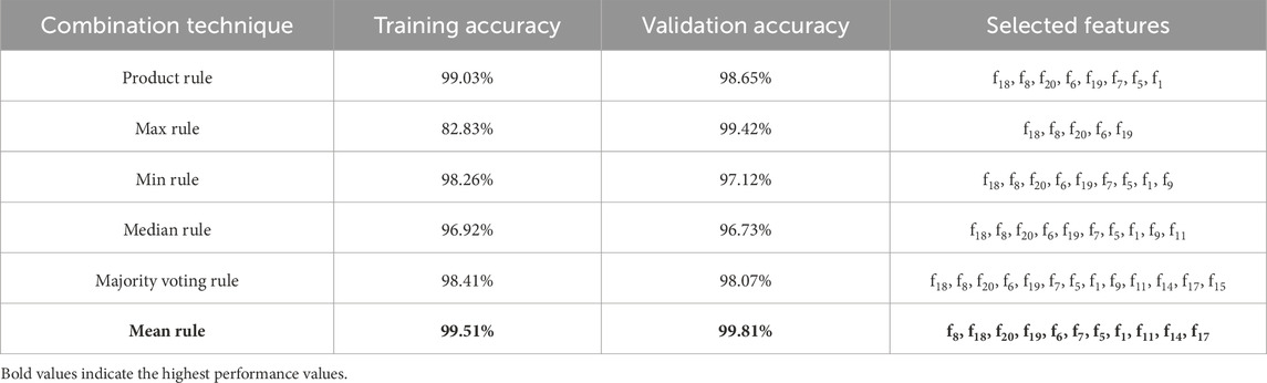Finally, the performance of the model is investigated using each combination technique and the selecting the extracted features according to their importance value. Figure 12 demonstrates the training and validation accuracies produced by the model using each combination techniques using a certain number of features, from the most to the least important based on Figure 11. As shown in Figure 12, the mean rule combination technique has been able to produce the highest accuracy during the training process (99.51%) using 11 features which are f8, f18, f20, f19, f6, f7, f5, f1, f11, f14, f17, in correct order of importance. Using the corresponding number of features, the mean rule combination technique has also proves to outperform five other combination techniques with 99.81% of accuracy when the model is validated. In addition, Table 8 provides a summarized report of training and validation accuracies as well as the selected features in correct ranking based on Figures 11, 12.