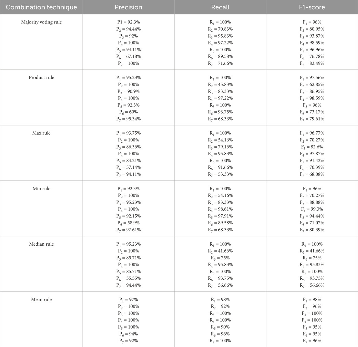 Furthermore, Figure 13 presents the validation confusion matrices, providing a comprehensive summary of the validation results. It clearly shows the final model accuracy during the validation process by carefully detailing the number of correct and incorrect classifications using different combination techniques. Also, Figure 14 provides information on three other evaluation metrics which are precision, recall, and f1-score which can be extracted from each confusion matrix based on Equations 26–29.