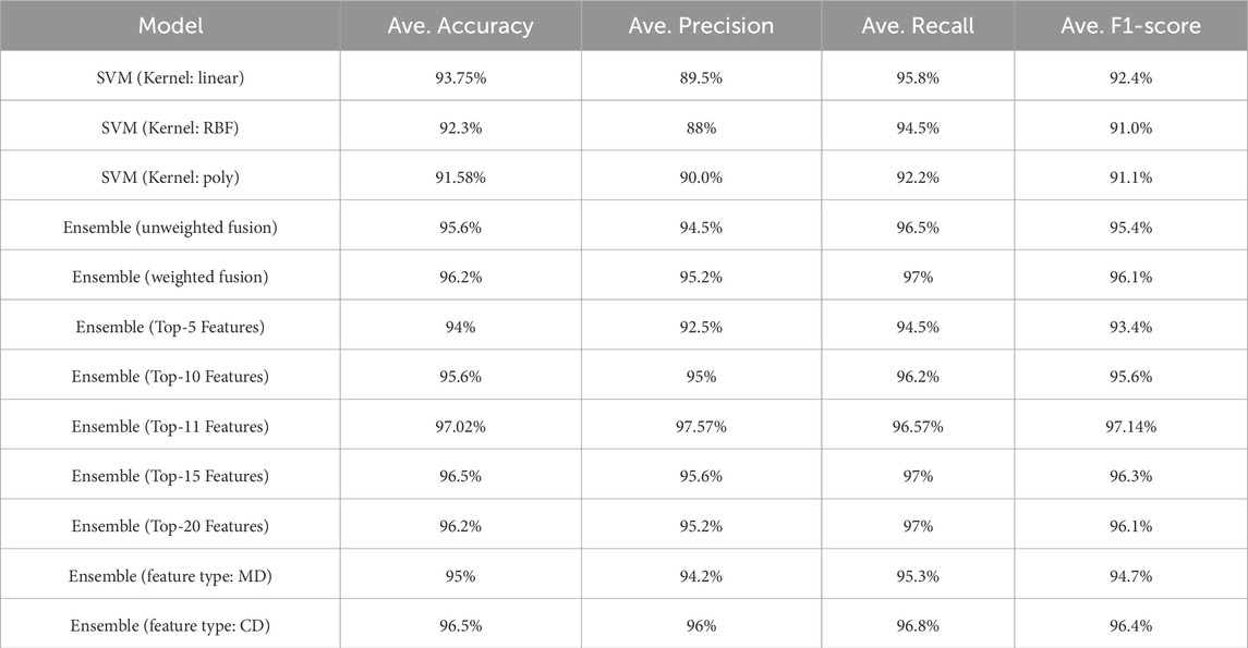 To provide a more detailed assessment, per-class test metrics (precision, recall, and F1-score) have been reported, as summarized in Table 9. Furthermore, ablation studies have been conducted considering (i) single model vs. ensemble settings, (ii) weighted vs. unweighted fusion strategies, and (iii) the use of top-k features and feature types. The corresponding results are presented in Table 10. These findings clearly indicate the benefits of ensemble learning and weighted fusion, as well as the impact of feature selection on classification performance.