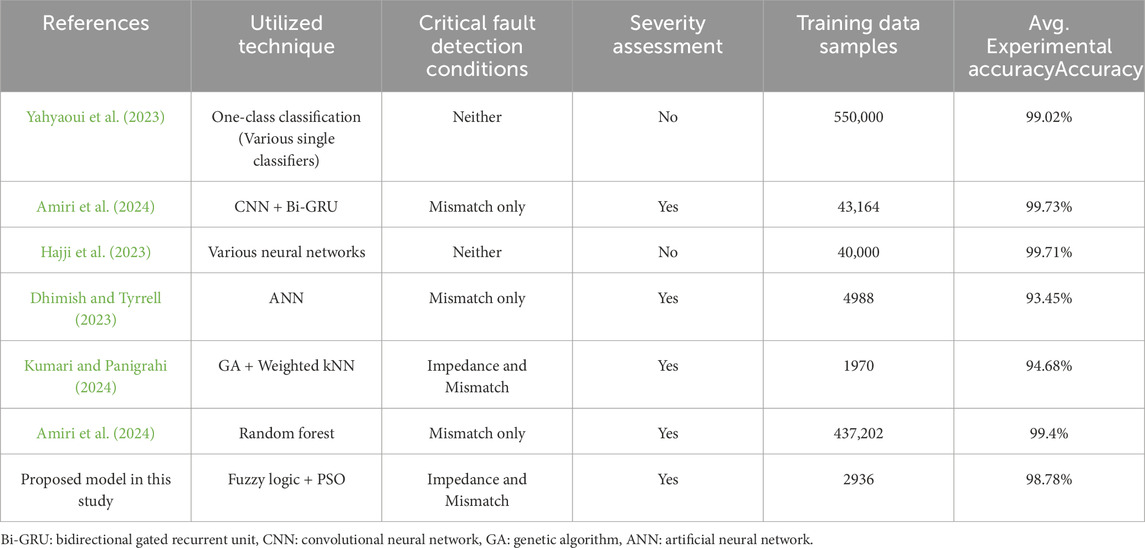 In order to confirm the superiority of the proposed fuzzy logic and PSO based model, according to Table 11, it is compared to several recent studies in the area of PV fault detection. To provide a fair comparison, various factors are considered, such as the recency of the studies (2023 and 2024), inclusion of modern strategies (e.g., deep learning), various comparison aspects (the ability of severity assessment, the number of required data samples, the consideration of critical conditions for fault detection, and the final experimental accuracies). According to Table 11, the following discussion can be presented: