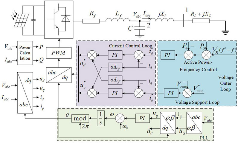 In prior studies, the frequency dynamic response of inverter-based source has typically been represented by constant-gain models or first-order inertial elements (Zhang and Mingjie, 2020; Zheng et al., 2019; Qinfeng et al., 2024). Although these simplified models facilitate analytical tractability, they substantially oversimplify the underlying inverter dynamics (Xiaokang et al., 2023), often leading to considerable deviations in simulating system responses to load variations and frequency disturbances. To improve model fidelity, advanced model reduction techniques—such as singular perturbation and balanced truncation—have been employed to derive reduced-order representations from multi-scale, high-order inverter models (Gao et al., 2022; Yonggang et al., 2020; Liu et al., 2021; Luyang et al., 2024; Junkai et al., 2022; Gao et al., 2021; Abd Elaziz and Oliva, 2018), enabling the characterization of slow-scale SFR behavior in renewable generation systems. In recent years, data-driven machine learning approaches have emerged as an important avenue for constructing system frequency response (SFR) models. For example, Ref. (Zhang and Wang, 2021) proposed an SFR modeling framework for integrated wind–solar–thermal power systems using balanced truncation combined with deep transfer learning. In Ref. (Bai et al., 2022), a multivariate random forest regression algorithm was trained to develop an SFR model for inverter-based sources. These modeling enhancements have indeed improved the accuracy of inverter frequency response characterization. However, traditional model order reduction techniques, such as singular perturbation, are predominantly developed from a mathematical abstraction perspective and often fail to capture the physical characteristics of inverter-based systems. As a result, they lack the ability to reveal the intrinsic mechanisms through which inverters participate in system frequency dynamics, thereby limiting their applicability in physically interpretable analyses and control-oriented applications. In contrast, data-driven approaches—while capable of yielding fast-responding surrogate models under ideal training conditions—typically demand large volumes of high-quality data to ensure robustness across a wide range of operating scenarios. Furthermore, these models often lack physical interpretability, thereby limiting their ability to reveal the underlying mechanisms of inverter operation and hindering their application in physically grounded control and analysis frameworks (Kouro et al., 2015; Ma et al., 2017; Liang et al., 2020).