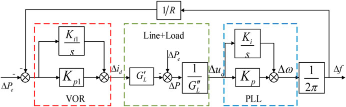 The simplified components mentioned above are indicated by shaded blocks in Figure 1 to enhance clarity. The linearized state-space model of the inverter-based source system under the frequency-dynamic timescale is provided in Appendix B. In the following sections, the frequency response model of the inverter is derived, with particular emphasis on the dynamic behavior over the time scale relevant to frequency and active power.