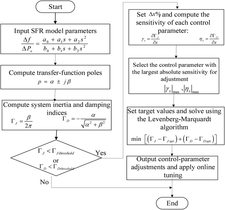 The workflow of the online inertia and damping enhancement strategy is illustrated in Figure 7. First, the current system inertia and damping indicators are calculated using Equation 29, and evaluated against the trigger condition defined in Equation 26. If either indicator falls below its respective threshold, the system enters the parameter optimization procedure. Subsequently, the sensitivities of the inertia and damping indicators with respect to all control parameters are computed. The control parameter with the largest absolute sensitivity is selected as the optimization variable, and its adjustment direction is determined by the sign of the sensitivity. Finally, an objective function is constructed to minimize the deviation between the inertia and damping indicators of the SFR model and their target values. The optimal adjustment of the selected control parameter is then obtained using the Levenberg–Marquardt algorithm.