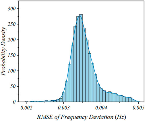 The RMSE results for all operating points were then subjected to probabilistic statistical analysis, and the probability density distribution of the errors was plotted, as shown in Figure 9. Smaller RMSE values indicate that the SFR model output closely matches the electromagnetic transient simulation results, demonstrating high model accuracy across different operating points. The RMSE values approximately follow a normal distribution centered around 0.0034 Hz, with most samples distributed within the range of 0.002 Hz–0.005 Hz. This indicates that the model errors are small and mainly caused by random fluctuations rather than systematic bias.