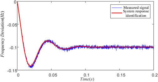To validate the identified model, the parameters obtained from the identification process were substituted into the proposed SFR model. A comparative analysis was then conducted between the model’s response and the electromagnetic transient simulation results. As shown in Figure 13, under the same active power step disturbance, the identified model’s response curve closely matches the observed signal from the electromagnetic transient simulation. The discrepancies in response time and overshoot are both less than 0.1%. These results demonstrate that the identified model exhibits high accuracy and effectively captures the actual frequency dynamics of the system.