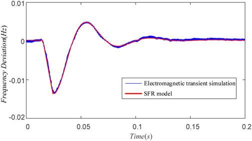 To further verify the applicability and robustness of the proposed method under different disturbance conditions, additional simulations were carried out. Taking an impulse disturbance as an example, when the system was subjected to a power impulse, the proposed LM-based identification method was applied to obtain a new set of parameters. These parameters were then substituted into the SFR model to evaluate its response under active power impulse conditions. The results were compared with the electromagnetic transient simulation, as shown in the figure.