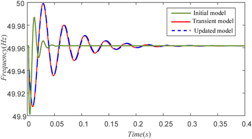 Figure 17 compares the response of the updated model with that of the electromagnetic transient model. The initial model shows a response time deviation over 60% and an overshoot deviation over 70% compared to the actual system. In contrast, the updated model closely matches the actual response, with all key performance index errors below 1%, remaining within acceptable limits. These results demonstrate a substantial difference between the models before and after updating. Without model updating, inaccurate frequency response predictions may mislead power system operators.