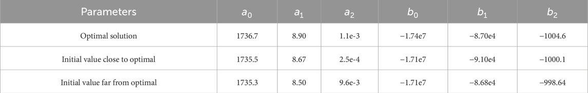 To investigate the impact of initial parameter values on the convergence performance of the identification method, this study compares the identified parameters obtained from initial values that are either close to or far from the optimal solution. Based on comparative experiments, the identification results are summarized in Table 1. Under both “near” and “far” initial settings, all parameters effectively converge to the vicinity of the optimal solution. The relative errors of the parameters range from 0.08% to 4.49%, with an average of approximately 1.9%, all within a narrow margin. These results indicate that the proposed method maintains high accuracy and stability even when the initial estimates deviate from the optimum, thereby demonstrating strong robustness.