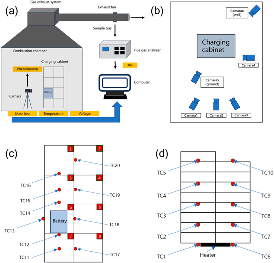 Figure 1. Schematic of the experimental setup: (a) overall system configuration based on the ISO 9705 test platform; (b) internal TC distribution (TC1-TC10) within the battery; (c) TC arrangement (TC11-TC20) inside the cabinet sections; (d) layout of the primary and auxiliary cameras surrounding the cabinet.