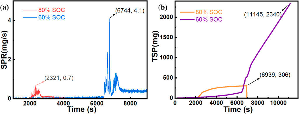 A comparison of the phenomena at different SOC levels in Figure 3 reveals that under the 60% SOC condition, smoke is released three times before open flames appear, whereas under the 80% SOC condition, smoke release is immediately followed by ignition. To investigate this phenomenon shown in the video, two typical fire parameters—the total smoke production (TSP) and the smoke production rate (SPR)—were analyzed. As shown in Figure 4, the combustion under the 80% SOC condition is intense and explosive, causing smoke to be insufficiently released before ignition. This leads to lower TSP and SPR, which correspond to the intense, low-smoke combustion observed. In contrast, under the 60% SOC condition, the fire is more stable, with a longer combustion duration and more smoke. As a result, the SPR remains high for an extended period, whereas the TSP is the highest, showing a linear increase over time.