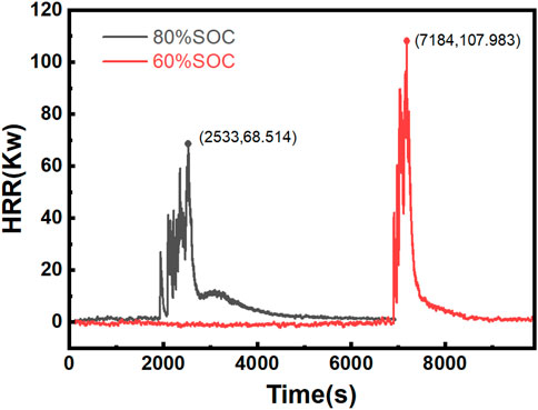 2. The smoke emission volume substantially influences the HRR characteristics. The lower-SOC battery (60%) achieves a higher peak HRR of 107 kW, surpassing that in the 80% SOC condition by 57%. This result correlates with its approximately 8-fold greater TSP compared with the 80% SOC condition.