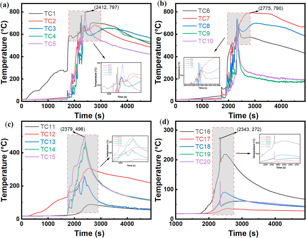 Figure 9 shows the temperature variation of the battery under 80% SOC over time. In (a) and (b) of Figure 9, TC1 is located on the heated compartment. Before TR occurs, only the temperature at TC1 rises with the increase in the temperature of the heating plate, whereas the temperatures of the other compartments remain relatively unchanged. At 1730 s, when TR occurs, the compartment containing TC1 undergoes TR, releasing a large amount of gas, which causes a brief drop in temperature, followed by a rapid increase as the battery explodes. Simultaneously, the compartments corresponding to TC2–TC10 sequentially experience TR. At this point, the battery stably burns, with each compartment continuously releasing combustible gases that sustain combustion, causing the temperature curves to oscillate. After approximately 2,500 s, the temperature increase phase ends, and the battery temperature starts to decrease. Among the measurement points, TC9 and TC10, positioned farthest from the heating plate, show the fastest temperature decrease, indicating that they are situated in the upper part of the flames, where the combustible materials inside are consumed first. Furthermore, while TC1–TC5 and TC6–TC10 are symmetrically distributed and TR begins at TC1, (a) and (b) show that after TR, the overall temperature change trends of the other compartments converge. The battery was placed on the left cabinet door during the combustion test. The temperature changes in the cabinet shown in (c) and (d) of Figure 9 clearly indicate that TC11–TC16 on the left side of the cabinet record higher temperatures than those on the right side (TC17–TC20). The other TC located beneath the battery on the cabinet door have the highest temperatures, with the peak temperatures exceeding 400 °C. The TC on the side (TC17–TC20) have a maximum temperature of no more than 150 °C, indicating that, under closed cabinet conditions, the combustion of the left-side battery has a minimal impact on the temperature of the right-side cabinet door.