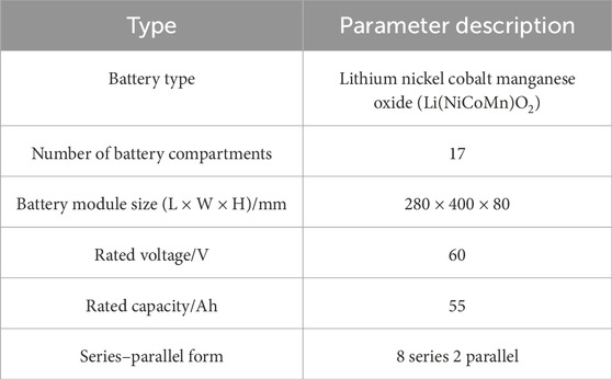 An 8-series-2-parallel lithium nickel cobalt manganese oxide (Li(NiCoMn)O2) battery module designed for electric bicycles was investigated. The detailed parameters of the module are presented in Table 1. The module consisted of 17 prismatic compartments arranged in a 280 mm (L) × 400 mm (W) × 80 mm (H) configuration, delivering a 60 V nominal voltage and a 55 Ah rated capacity. During testing, modules at 60% and 80% SOC were subjected to controlled thermal abuse via heating plates under 5 °C/min temperature ramping until TR initiation.