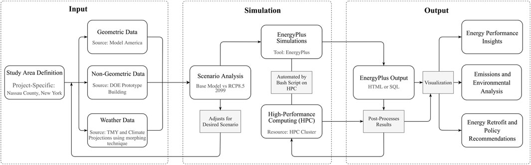 This study utilizes a comprehensive simulation workflow to assess urban buildings’ energy performance under current and future climate conditions. The workflow encompasses several key stages, including the preparation of building models, the configuration and execution of simulations on an HPC cluster, and the post-processing of simulation results to analyze energy use and emissions. This can be easily customized with region-specific data and climate scenarios, making it suitable for modeling urban energy use in diverse geographic and climate contexts.
