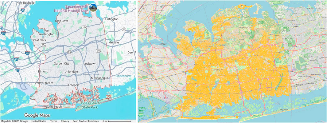 Figure 2. Nassau County, Long Island, New York. (Left) Study area shown on Google Maps (data source: Google Maps; Map data ©2025 Google). (Right) Outlines of simulated buildings generated in QGIS using building layout coordinates from Model America EnergyPlus files. North is up; the scale bar shown in the left panel applies to both panels.