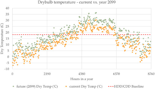 While the TMY data offers simplified future climate conditions, it allows for scalability and broad applicability in building energy simulations. Future research could incorporate more complex weather models that capture temperature extremes and other meteorological variations to refine these projections.