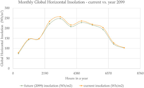 One limitation is that the morphed data retains the characteristics of TMY data, meaning that extreme weather events are not fully captured. The baseline climate, derived from a Long Island weather station, may not fully represent all areas in Nassau County, but it is within the mixed-humid (4-A) climate zone. Figures 3, 4 compare current and future climate scenarios for average daily temperatures and monthly solar radiation. A standard baseline of 18.33 °C was defined for both Heating Degree Days (HDD) and Cooling Degree Days (CDD) calculation.