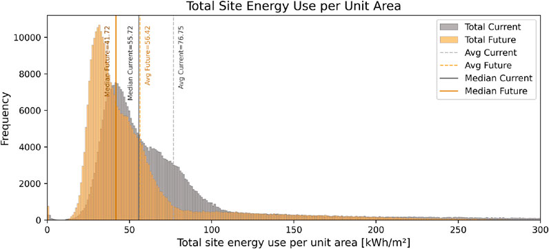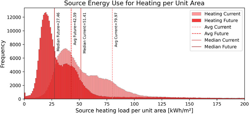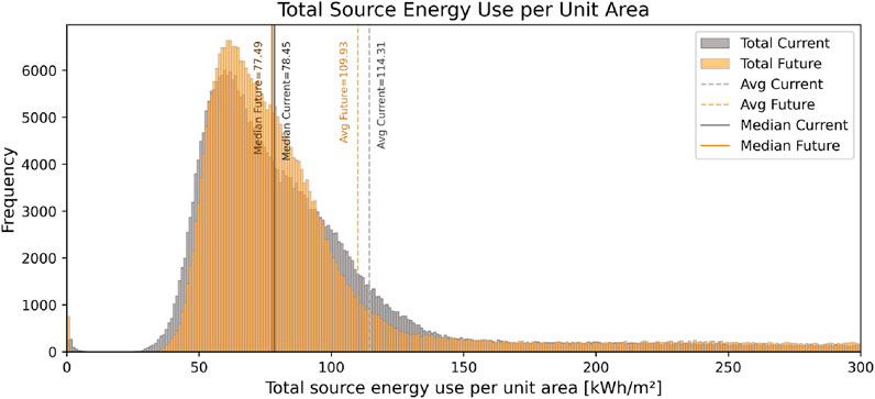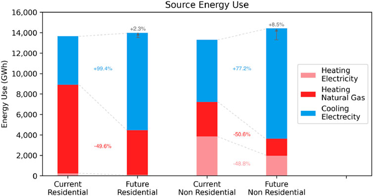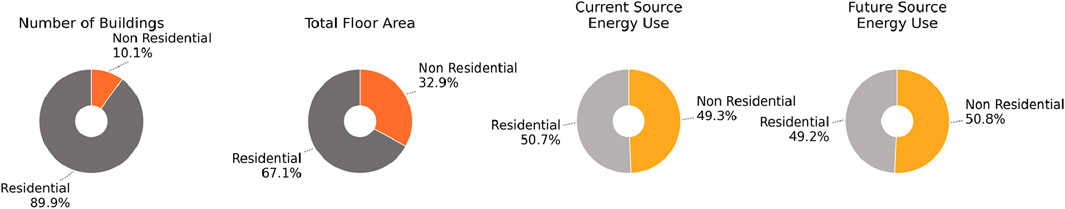 A notable point from Figures 11, 12 is that the amount of the source energy used is almost equal in residential and non-residential buildings within a margin of 5%. This is true for both current and future scenarios. This leads to a further breakdown in Figure 13. Despite non-residential buildings constituting a relatively small percentage of the total number of buildings (10.1%) and representing 32.9% of the total floor area, interestingly, they are responsible for 49.3% and 50.8% of the total source energy use in current and future scenarios, respectively. This emphasizes the critical role they play in the future energy use landscape that must be addressed (Mariano-Hernández et al., 2021). Despite their smaller share of the stock, non-residential buildings dominate future source energy use because they are substantially larger in floor area on average, rely more heavily on electricity for both heating and cooling, and are therefore more affected by the higher source-to-site conversion factor for electricity compared to natural gas.