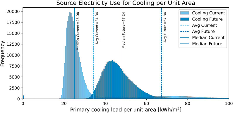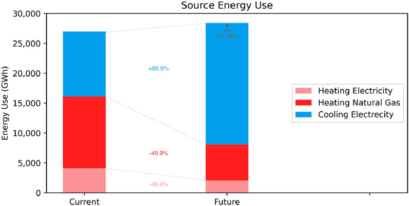 In general, for both source and site energy, a substantial reduction in heating and a significant increase in cooling loads are observed. Although the results indicated that the site energy use will be reduced by almost 20% in the future scenario due to the milder winters, which is the dominant load for this climate zone, this is not the case for source energy. The total source energy is increased by over 5% in the future case, since the increase in cooling loads, which is solely provided by the electricity, not only cancels out the savings in milder winters in the future but also increases the total source energy use.