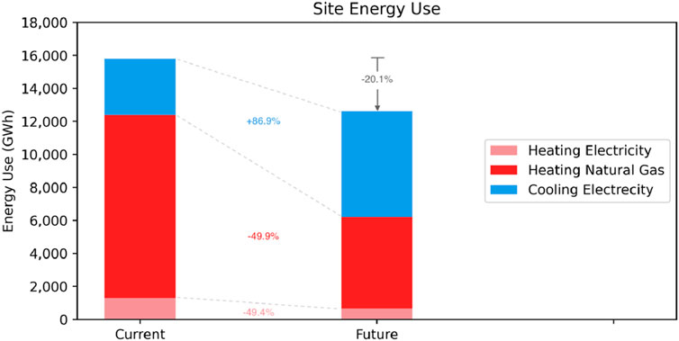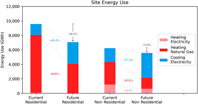 • The quantitative evidence of future energy transitions showed that whereas site energy demand decreases by ∼20%, source energy consumption increases by ∼5%, due to more electricity consumption for cooling, which is a significant observation in evaluating electrification possibilities under conditions of global warming.