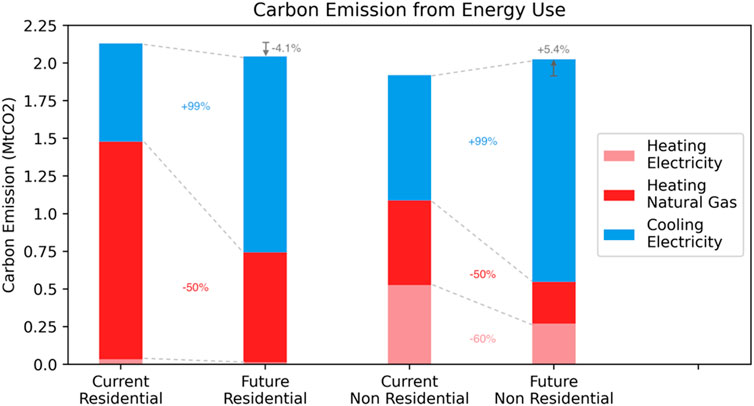 Moreover, Figure 14 shows carbon emissions as a result of the energy use for current and future scenarios. The emission factors are defined according to the U.S. Environmental Protection Agency (EPA) for gas and electricity at (U.S. Environmental Protection Agency (EPA), 2021) and (U.S. Environmental Protection Agency (EPA), 2024) respectively. The emission factor that is used for electricity in this study is specifically defined with respect to the electricity production sources in Long Island, NY. As it is clear from the results, like the source and site energy uses, a substantial reduction of 50% in carbon emission can be seen due to the reduction in gas consumption for heating, while the emission produced by electricity consumption for cooling increased significantly, about 99%, in both residential and non-residential buildings. The total carbon emission is estimated to decrease by about 4% in residential buildings, while it is a 5% increase in non-residential buildings, from the current to the future case. These results highlight how different types of buildings use energy and affect the environment, showing that specific plans are needed to reduce carbon emissions from various building sources (Ang et al., 2023).