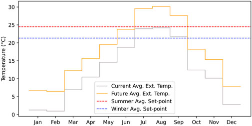 Figure 15. Average external temperature for current and future scenarios and summer and winter temperature set-points.
