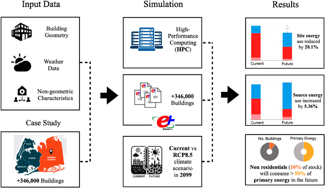 Keywords: urban building energy modeling, high-performance computing, climate change impact, building electrification, grid decarbonization, future weather scenarios, urban planning