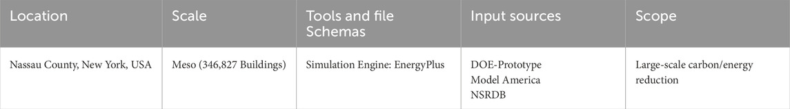 Large-scale and UBEM help to quantify the impact of climate change on energy consumption patterns in urban areas and their influence on heating and cooling demands. This allows researchers to assess how climate change may cause shifts in energy usage in urban buildings. One study in Baghdad applied a degree-day methodology and found that summer cooling accounted for nearly 40% of total city energy use under future warming, with associated increases in pollution (Abed Hassan and Ismail Husain, 2022). A large-scale U.S. analysis combining climate change, population growth, and power sector decarbonization showed that while efficiency and location shape local outcomes, population growth could raise energy use by over 50%, while decarbonization could reduce it by about 17%, with climate change itself contributing a modest further reduction (Wang et al., 2023). In another study, Bass and his colleagues conducted research to quantify the impact of future IPCC climate scenarios on US commercial buildings' energy use (Bass and New, 2023). Their results show a significant increase in total energy use in future scenarios, for the warmest parts of the US, as a result of an increase in cooling loads, and a substantial reduction in coldest areas, due to a decrease in gas needs and heating loads. Across these studies, including (Deng et al., 2023), the results show a significant reduction in heating loads and a considerable increase in cooling loads, as a result of climate change, but the overall energy use in the future primarily depends on the climate zone in which the study is conducted, and can be positive or negative. City-scale analyses for New York City project substantial rises in summer cooling under future warming (Ortiz et al., 2018), and validated simulations for Beijing indicate that the urban heat island increases cooling while reducing heating (Xu et al., 2018), together framing our expectation of cooling increases and heating decreases in dense urban areas. In parallel, grid-level forecasts such as the 2025 NYISO Gold Book project rising electricity demand in Zone K (Long Island) through 2055, reflecting regional electrification and load growth (New York Independent System Operator (NYISO), 2025). While broader in scope than UBEM, such studies share the goal of anticipating future energy needs under changing climate conditions.