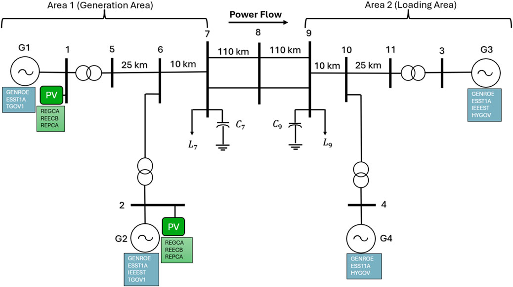 All simulations were performed in Power System Simulator for Engineering (PSSe) automated by Python, using the Kundur two-area (four-generator) model available from the Illinois Center for a Smarter Electric Grid (ICSEG) at the University of Illinois at Urbana-Champaign. The key change in the analysis is that the penetration of renewable power in Area 1 has increased incrementally, and no change is reflected in the inertia of the loading area (Area 2), as shown in Figure 1. This strategy deliberately makes the generation region weak, leaving the inertia of the system unevenly distributed over the system. One of the objectives is the investigation of the influence of this unbalanced distribution of the inertia on the oscillations of the systems and small signal stability. The study aims to determine the stability boundaries of the system as inertia decreases by increasing renewable penetration within the generation regime, thereby providing insights into how such transformations may impact oscillatory modes and the system’s overall stability.