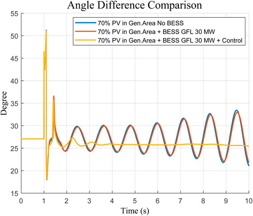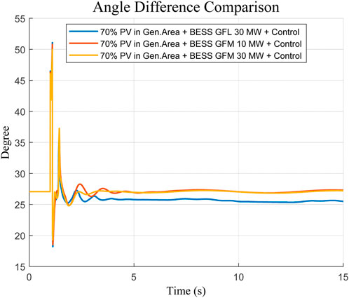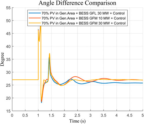In addition, the passing analysis of the fault condition between bus seven and bus eight will also confirm this fact. GFM BESS also stabilized the inter-area angle difference, apart from the smooth variation of tie-line power flow, which also converged faster once and had a lower overshoot in comparison with the GFL-controlled case.