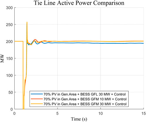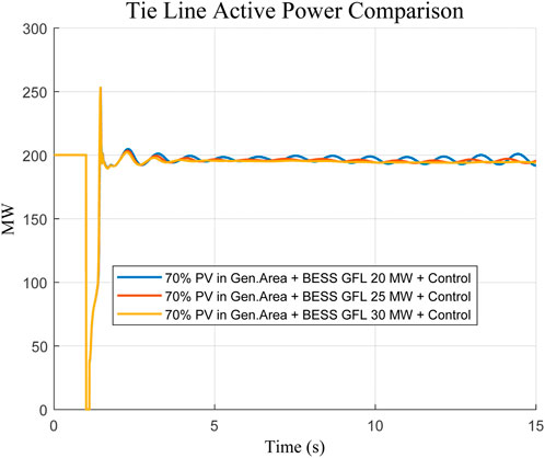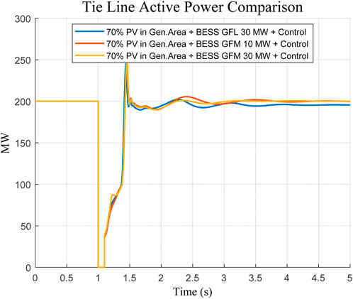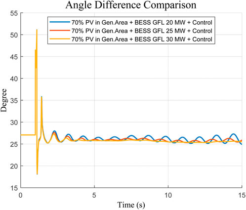 The better performance of the GFM configuration was also confirmed in time-domain simulations, which were based on an identical severe fault scenario (three-phase fault cleared after 0.1 s). Angular difference and tie-line power response oscillations were suppressed quickly, and the rate of convergence was even faster, causing an insignificant amount of residual oscillations. Moving on to the point where a larger 30 MW GFL BESS was directly compared against this, achieving a total of 30 MW peak power and 30 MW holding power, it is noted in Figures 5–8 that this still demonstrated commendable performance.