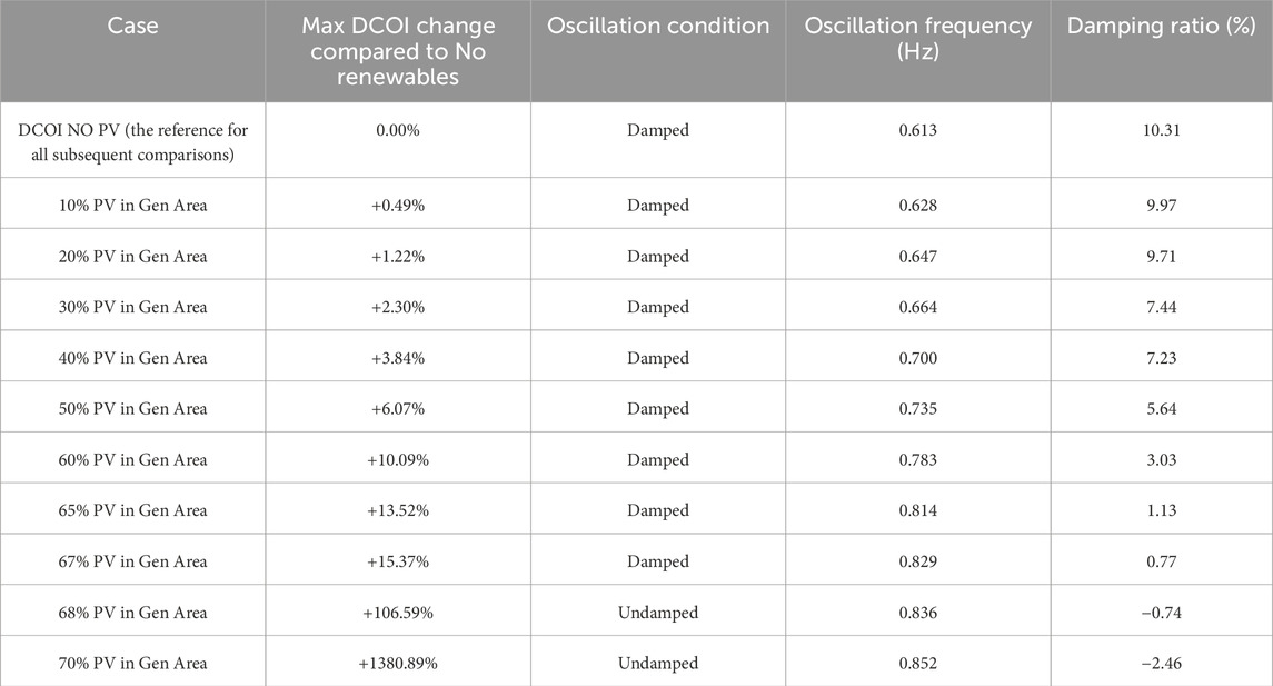 One of the findings is the sharp growth of the deviation of the DCOI with the increase in the PV penetration rate to 68%–70%. The system is only marginally stable up to 67% PV, but a qualitative transition to instability takes place after that value. This transition is characterized by a sudden increase in DCOI (from ∼13 to over 1,300%) as well as a change in modal damping to go negative.