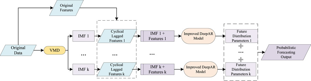 First, the VMD algorithm decomposes the original load sequence into k intrinsic mode functions (IMFs) with different center frequencies, thereby mitigating the effects of non-stationarity and randomness on the forecasting accuracy. The original load features (such as meteorological and temporal factors) are then combined with each IMF component and its cyclical lagged features to construct an enhanced feature set. The improved DeepAR module subsequently performs probabilistic forecasting for each IMF component independently. Finally, the point forecast and uncertainty quantification of the load are obtained by reconstructing the forecasting results of all IMF components.