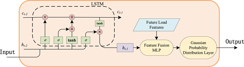 The output of the MLP, hmlp, replaces the hidden state hi,t used for parameter estimation in the original DeepAR, ultimately obtaining the load probability distribution parameters for the future M time steps. Unlike the original DeepAR model that generates forecasts autoregressively (step-by-step), our improved module directly outputs the parameters of the probability distributions for all future M time steps in a single forward pass. This is achieved through separate linear output layers that map hmlp to vectors of the means and standard deviations for the entire forecast horizon. This non-autoregressive design is enabled by the fact that all future known features (e.g., calendar information) are already available at the time of forecasting. By processing the entire future context Fi simultaneously, the model can learn interdependencies between different future time steps and generate a coherent multi-step forecast without the risk of error propagation inherent in autoregressive models. This structure enables the model to simultaneously utilize the temporal dependencies of historical sequences and the prior knowledge of future known information, making full use of the available information for load forecasting, thereby improving the accuracy and reliability of load forecasts.