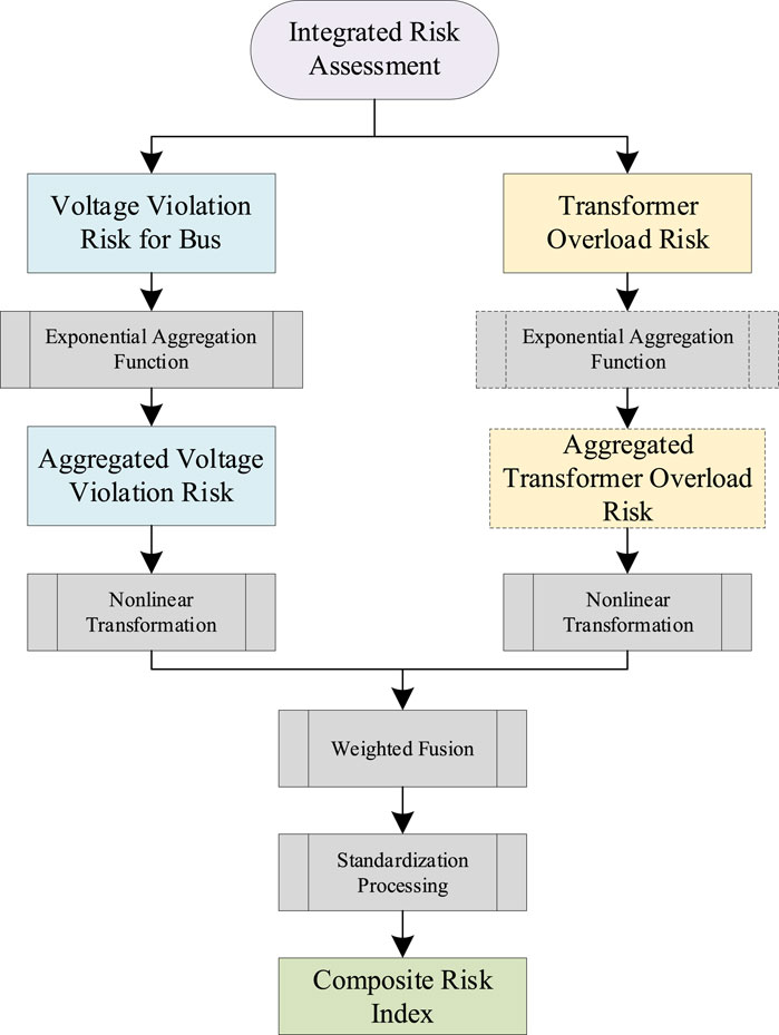 First, the voltage violation risk for each bus is assessed independently, obtaining the voltage deviation risk indicator for each bus. Subsequently, an exponential aggregation function is used to synthesize the risks of all buses, forming a system-level voltage violation risk indicator. Simultaneously, the overload risk of distribution transformers is assessed. If multiple transformers exist, an exponential aggregation function is similarly used to synthesize the overload risk indicators of all transformers, obtaining a system-level transformer overload risk indicator. Furthermore, a nonlinear transformation and weighted fusion method is utilized to combine the above two types of system risk indicators, resulting in a comprehensive risk indicator for each time step. Finally, risk indicator output standardization is performed by setting extreme risk thresholds.
