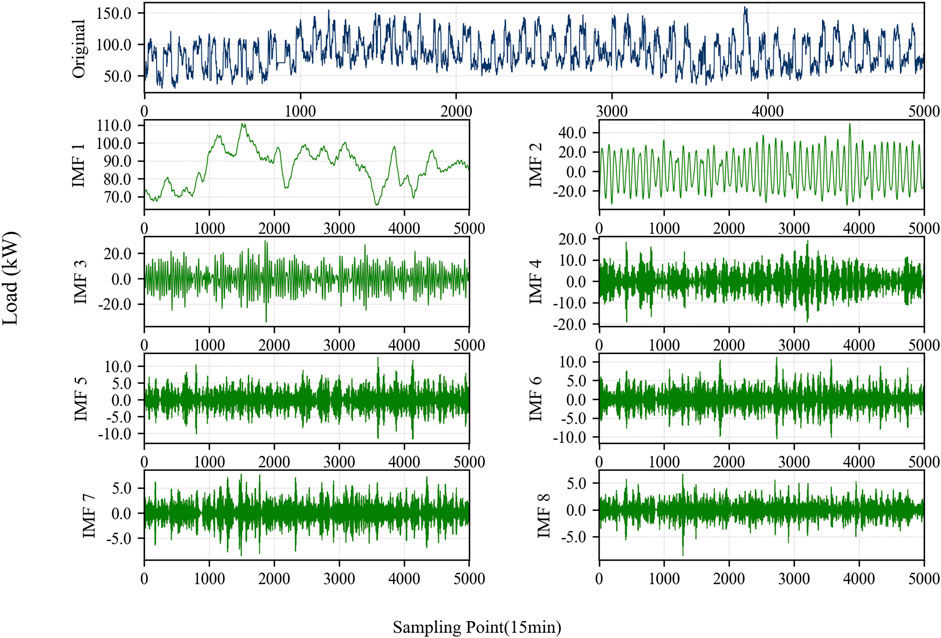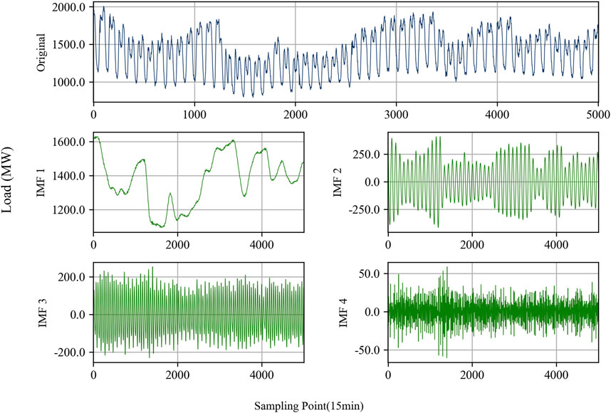 The VMD decomposition is performed by numerically solving the constrained variational problem defined in Equations 2–4, with the penalty parameter α in Equation 4 set to 1,000 and the ADMM convergence tolerance set to 1e-7. To balance prediction efficiency and accuracy, the number of decomposition modes is set to 4. A segment of 5,000 sampling points is selected to display the VMD decomposition results. The original load curve and the sequences decomposed using the VMD method are shown in Figure 4. The figure shows that the decomposed sequences exhibit clear periodicity and stable frequency, without mode mixing.